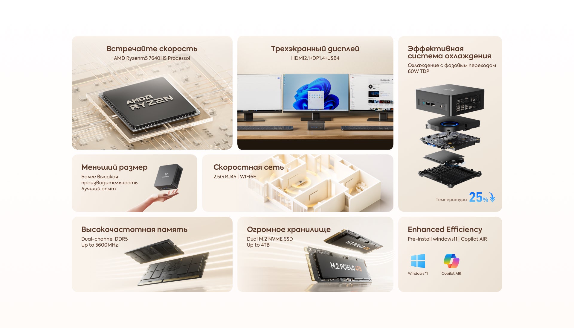 UM760 Slim обеспечивает бесперебойную многозадачность благодаря высокоскоростным портам USB4, HDMl 2.1 и соединениям Dp 1.4. Легко подключайте до трех дисплеев 4K, чтобы ускорить свой рабочий процесс и повысить эффективность.