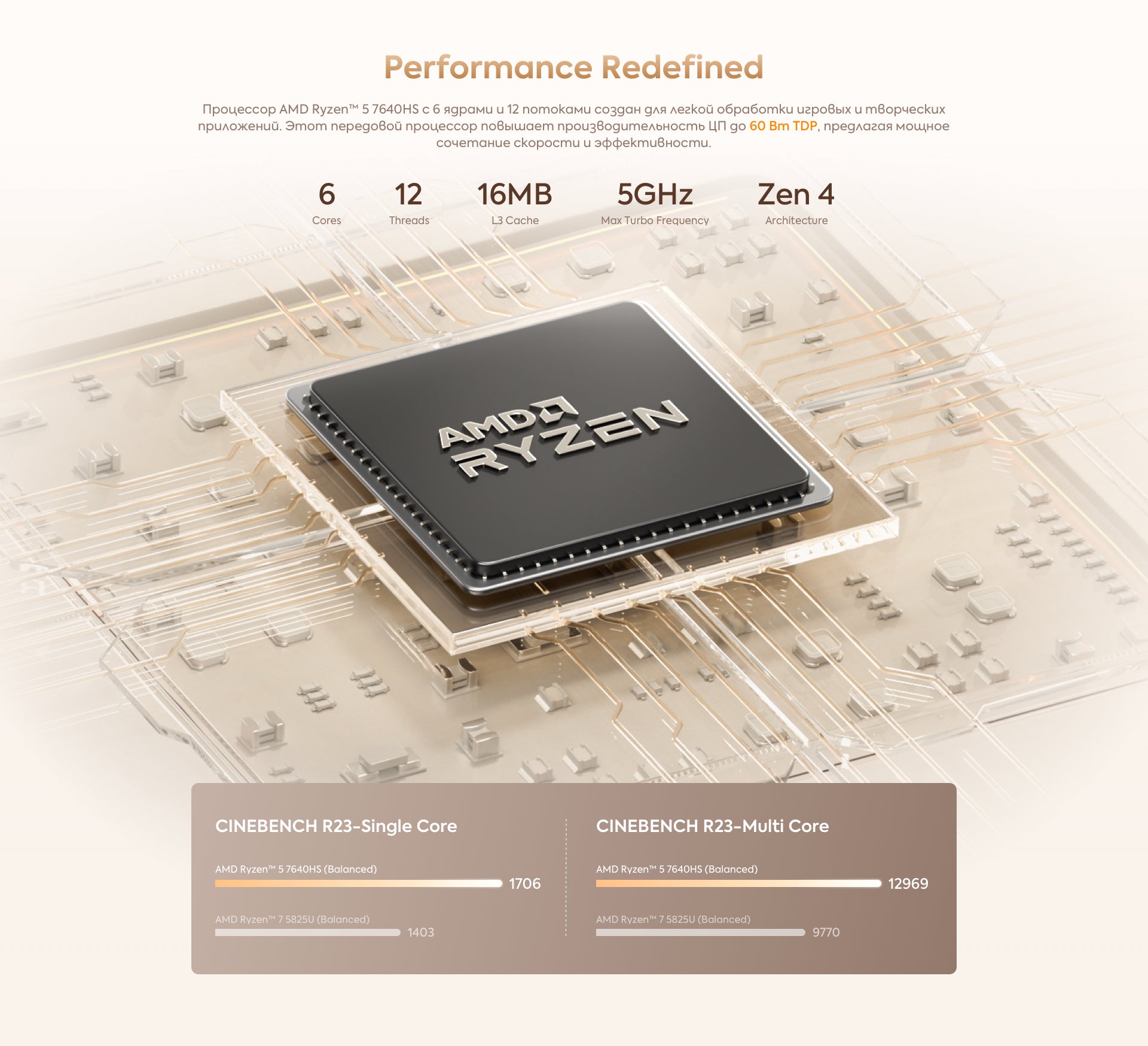 - Processor: AMD Ryzen™ 5 7640HS Processor, 6 Cores/12 Threads