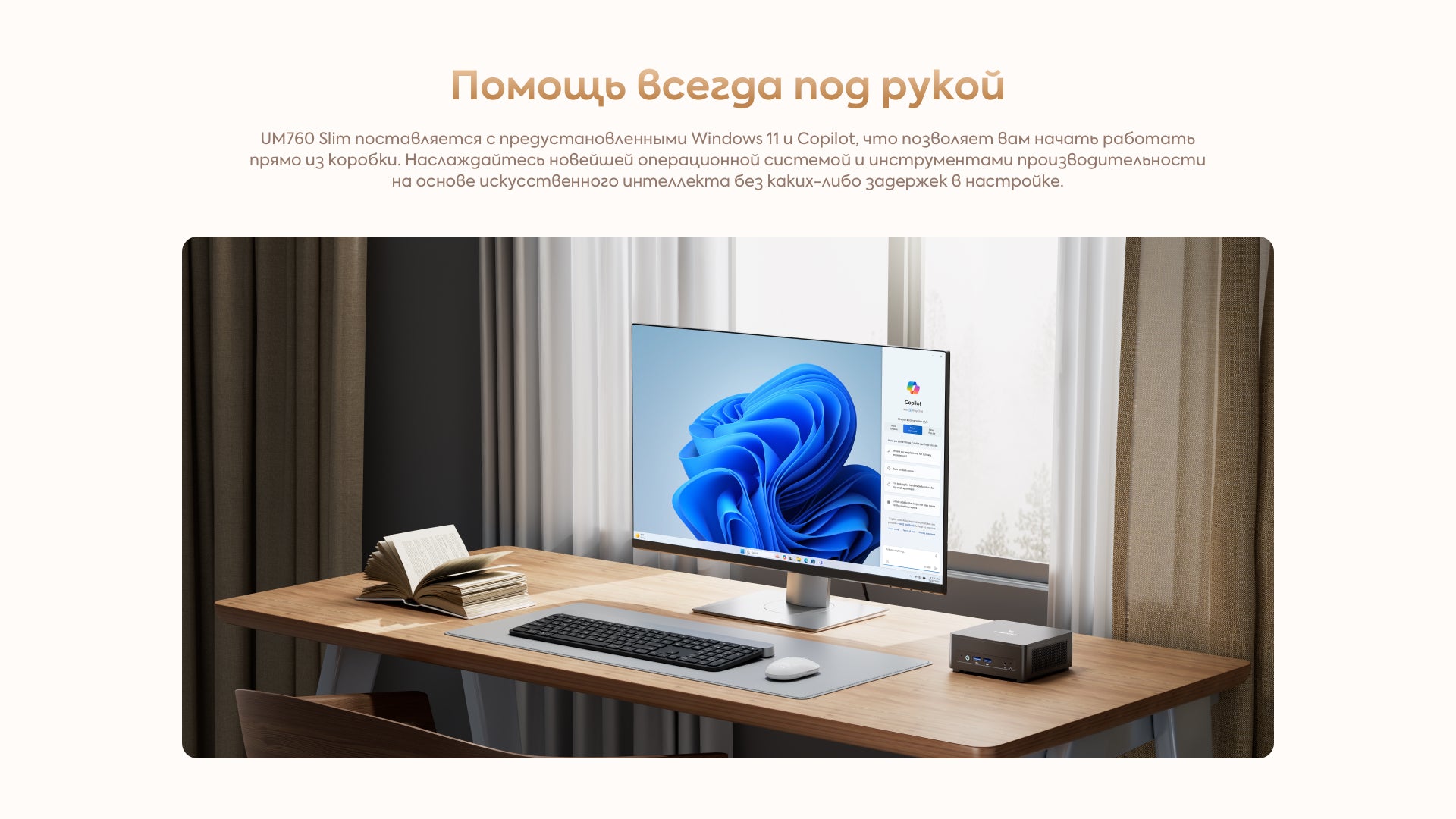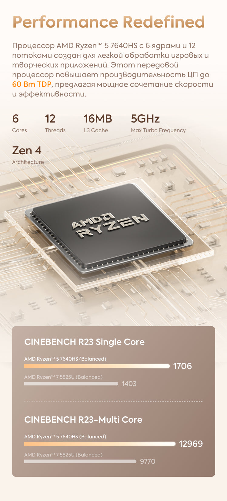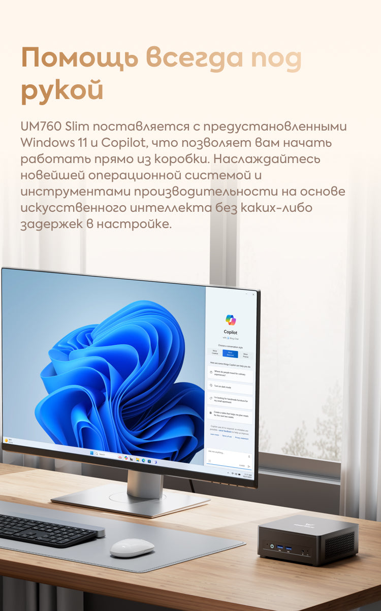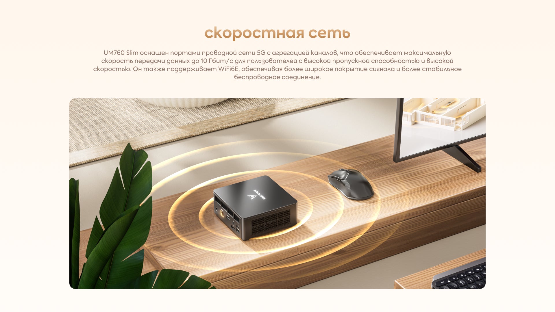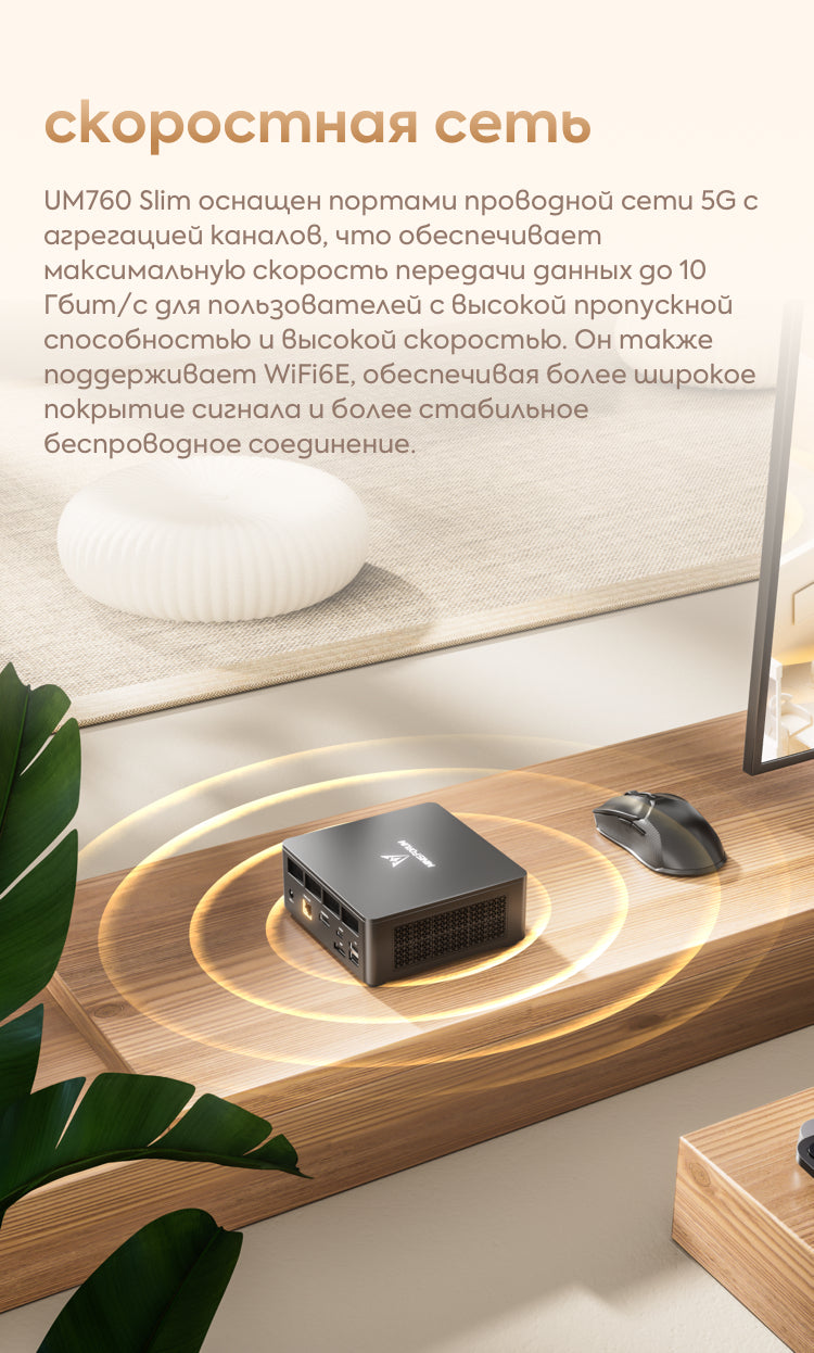 UM760 Slim создан, чтобы впечатлять, будь то повседневные задачи или творческие проекты. Благодаря AMD Radeon 760M он обеспечивает надежную производительность и плавную работу, эффективно справляясь со всеми вашими вычислительными и мультимедийными потребностями.